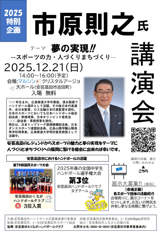 広島県出身の元ハンドボール選手、現日本ハンドボール協会副会長の市原則之さんによる講演会が開催されます。
